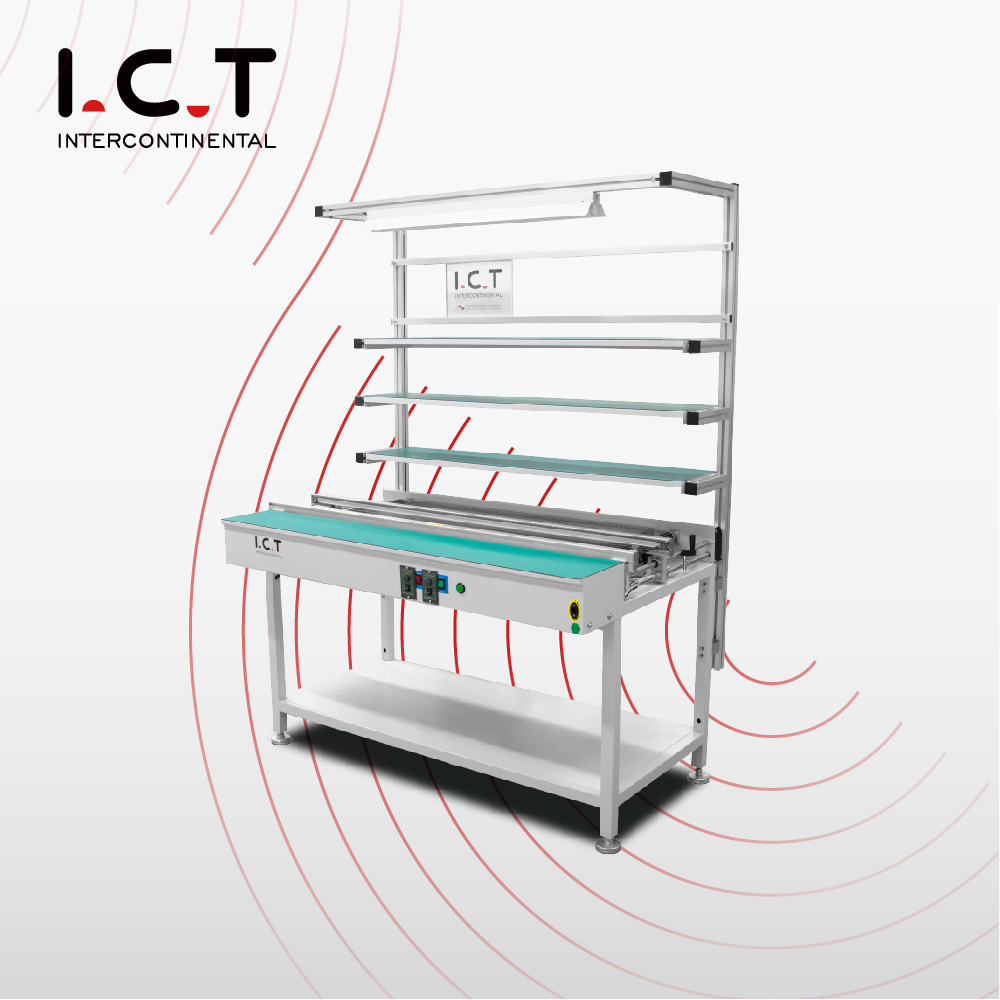 I.C.T предлага повече от десет типа конвейери, така че всяка фабрика да работи перфектно. Стандартните свързващи транспортьори просто прехвърлят дъските. Станциите за инспекция добавят ярки светлини. Телескопичните и отхвърлящите модули отговарят на специални оформления. Усъвършенстваният конвейер за запечатване на печатни платки SMT се предлага с ръчен капак, капак с автоматично повдигане, еднолентова или двулентова версия, плюс допълнителен въздушен душ или йонизатор за ултра-чиста среда. Предлагат се и верижни и буферни модели за тежък режим на работа. Всяка линия за сглобяване на конвейерни печатни платки може да бъде напълно персонализирана по дължина, височина, тип покритие и интелигентни функции, за да отговаря на вашите точни изисквания за чистота.