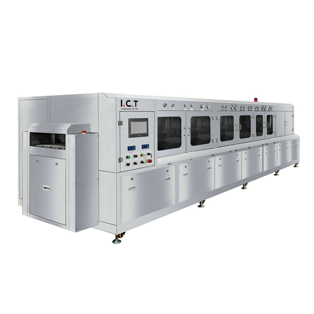 За високи обеми на производство и минимално разнообразие от компоненти, он-лайн почистващите препарати I.C.T-6300 са спестяващо време и рентабилно решение при почистване на електронни компоненти. Отпечатаните платки се движат автоматично на конвейерна лента през индивидуалните стъпки на процеса, където почистването, изплакването и сушенето се извършват в отделни камери.